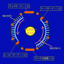 チャオガーデン入口からは、チャオ幼稚園の近くからダークガーデンへ降りる階段が見えるチャオ。